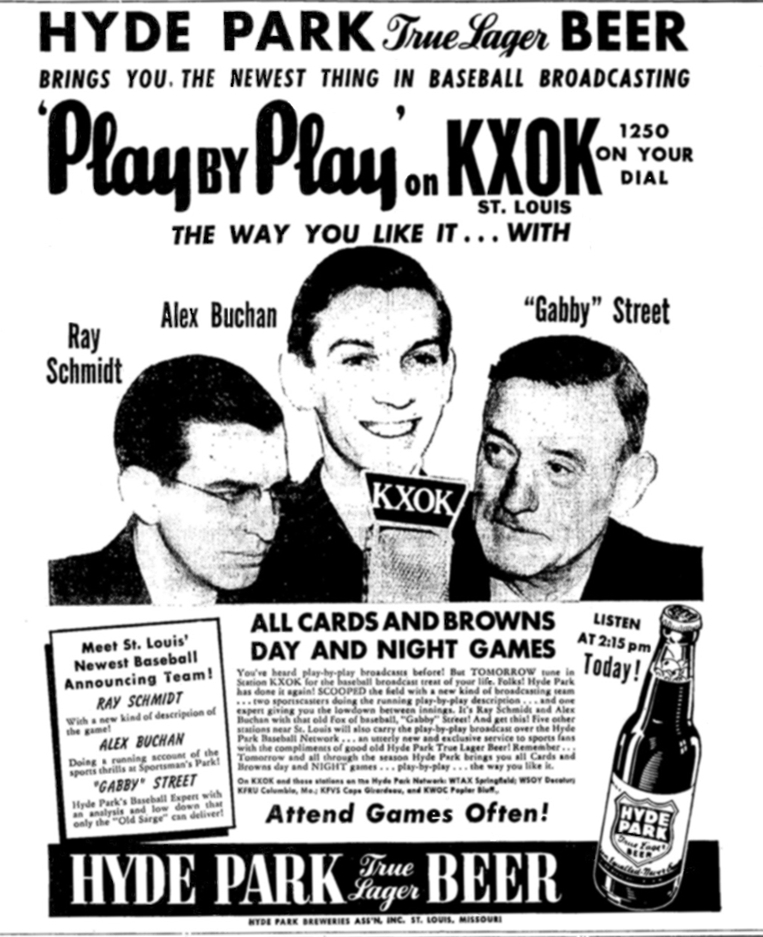- Hyde Park Beer brings you St. Louis Cardinals and Browns baseball broadcasts on KXOK in this 1940 advertisement.