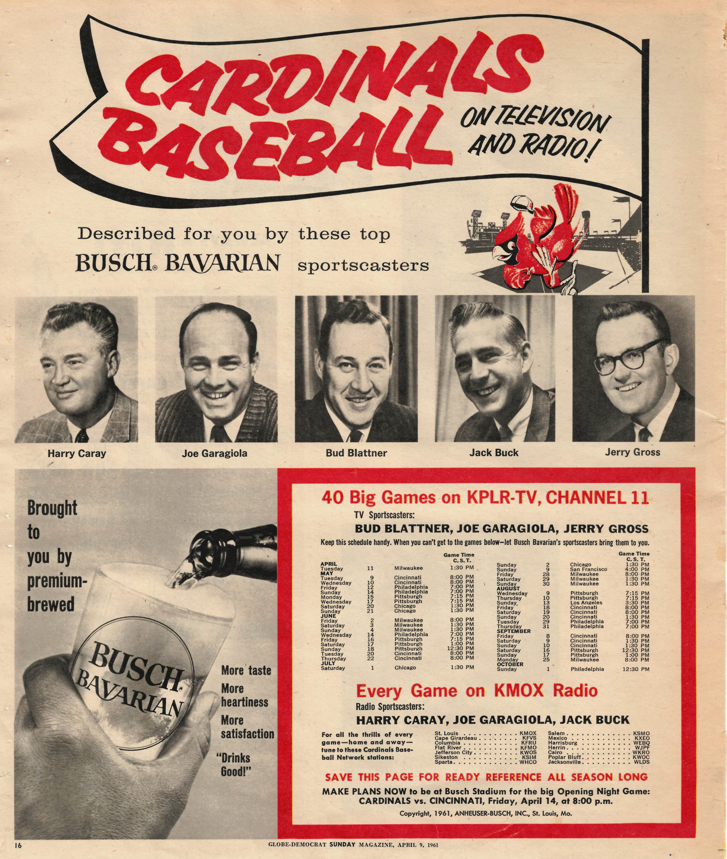 - Busch Bavarian Beer and KPLR-TV Channel 11 deliver televised Cardinals games and KMOX Radio deliver radio broadcasts in 1961.