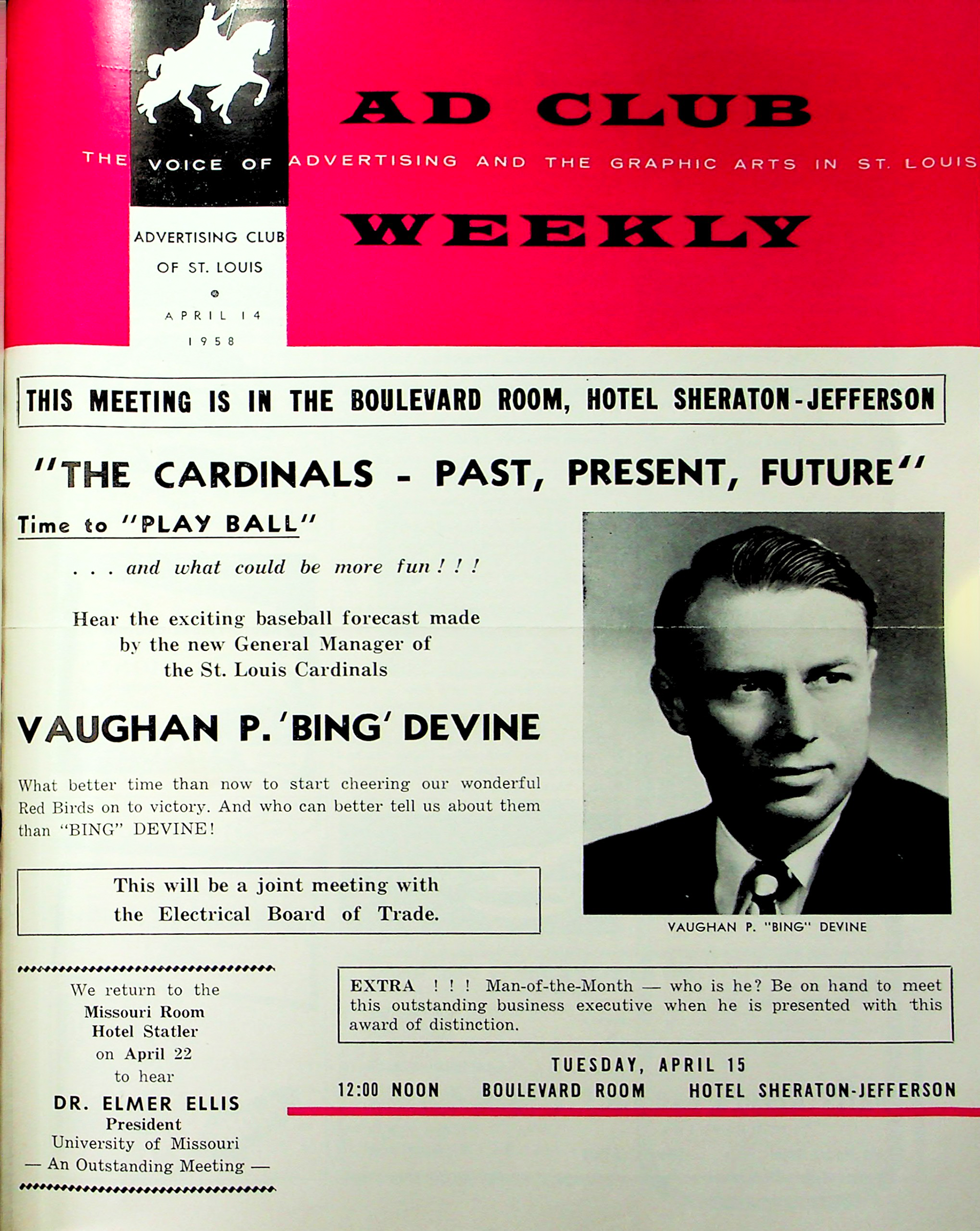 - The Advertising Club enjoys a long history celebrating baseball and the St. Louis Cardinals. New General Manager Bing Devine was guest of the Ad Club in April 1958 to talk Cardinals baseball. Devine, a St. Louis native and Ad Club member, served as Vice President and General Manager of the Cardinals from 1958-1964. Ironically, it’s often stated that Branch Rickey’s meddling into the Cardinals front office in 1964 contributed to Devine’s dismissal prior to the 1964 World Series as well as Rickey’s firing in 1965. Devine returned to the Cardinals from 1968-1978. Bing Devine is a member of the Missouri Sports Hall of Fame and is remembered for bringing Lou Brock to the Cardinals.