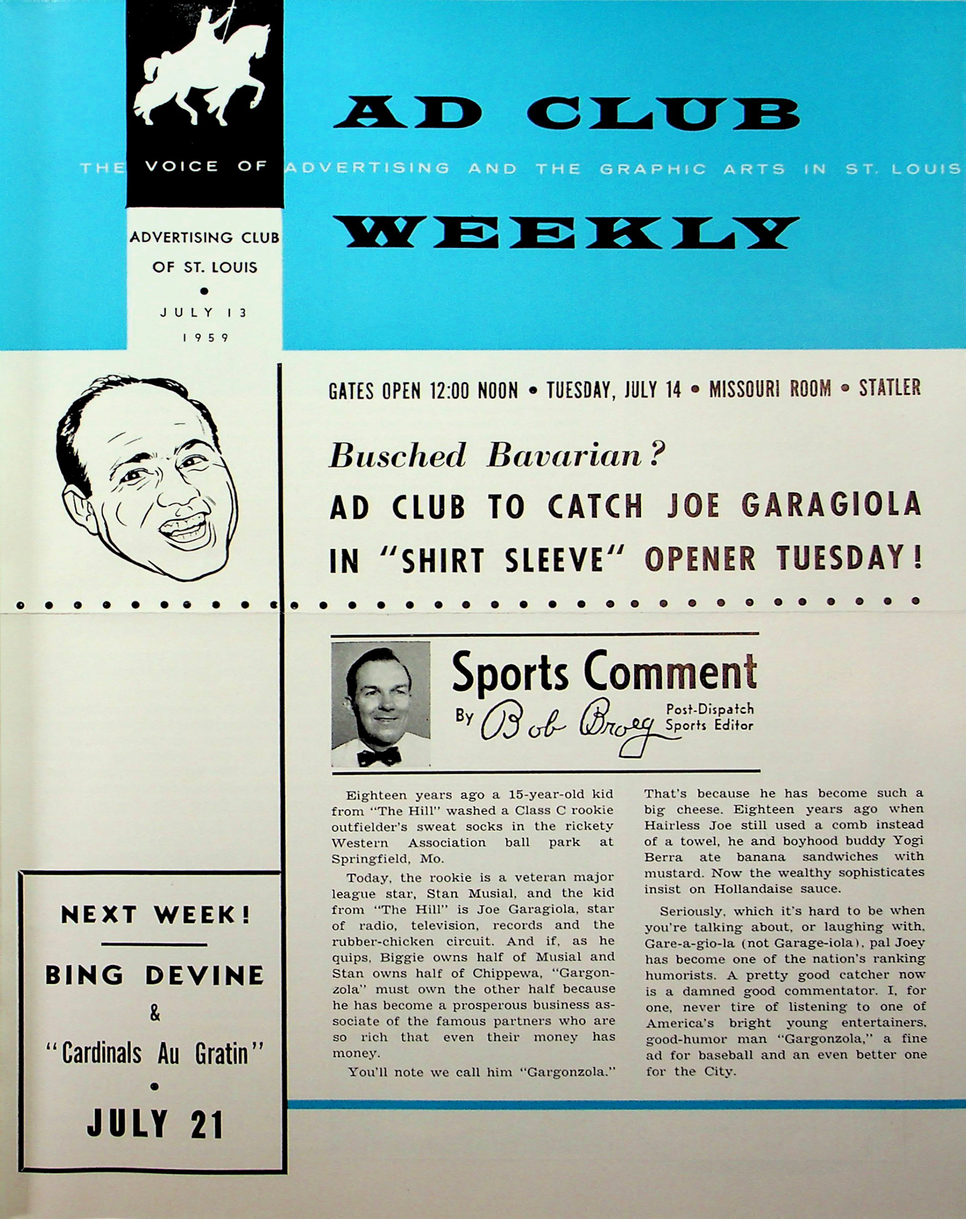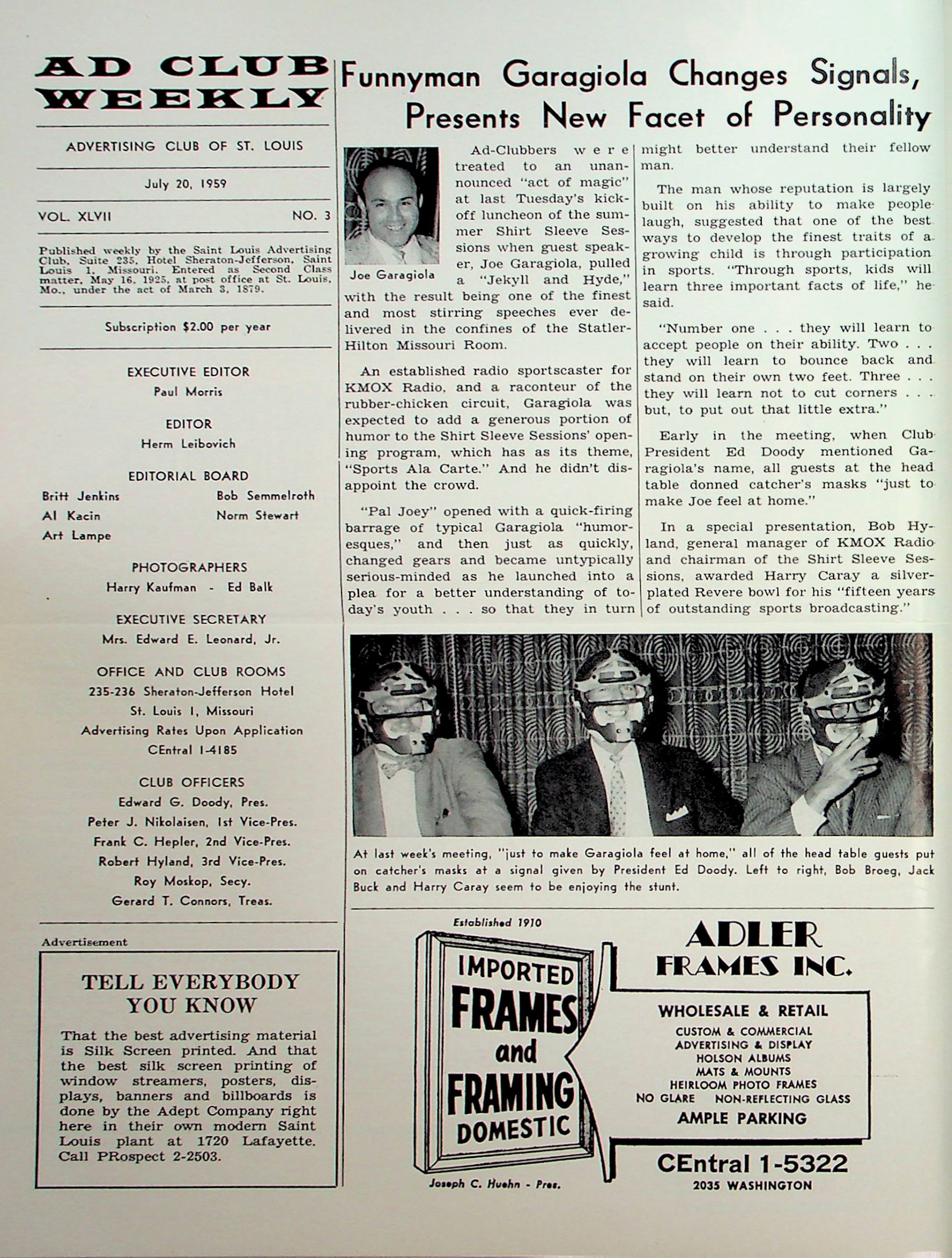 - Review of Joe Garagiola speech in the following Ad Club Weekly on July 20, 1959. Picture shows sports writer Bob Broeg and broadcasters Jack Buck and Harry Caray wearing catcher’s masks to “make Garagiola feel at home”