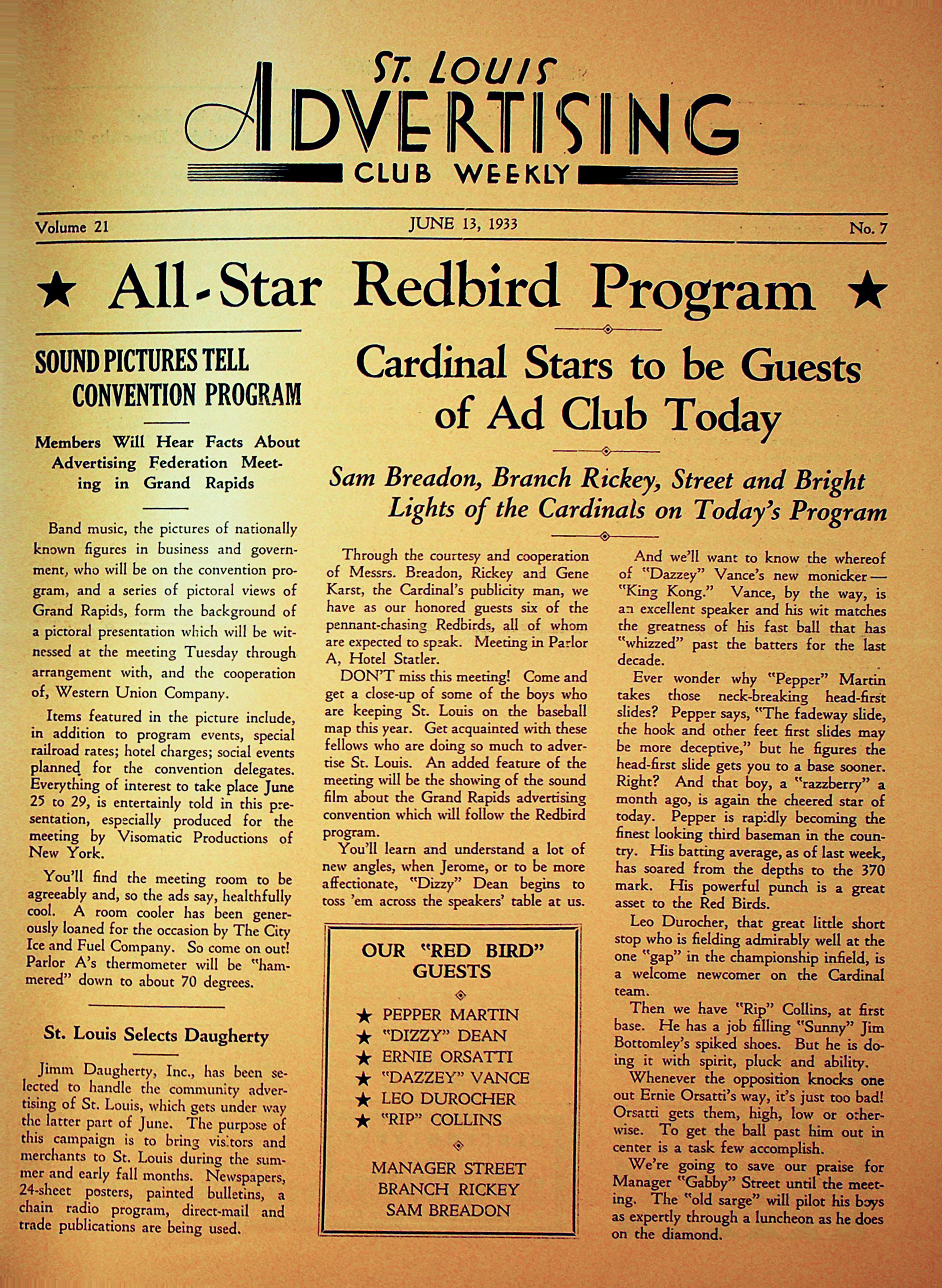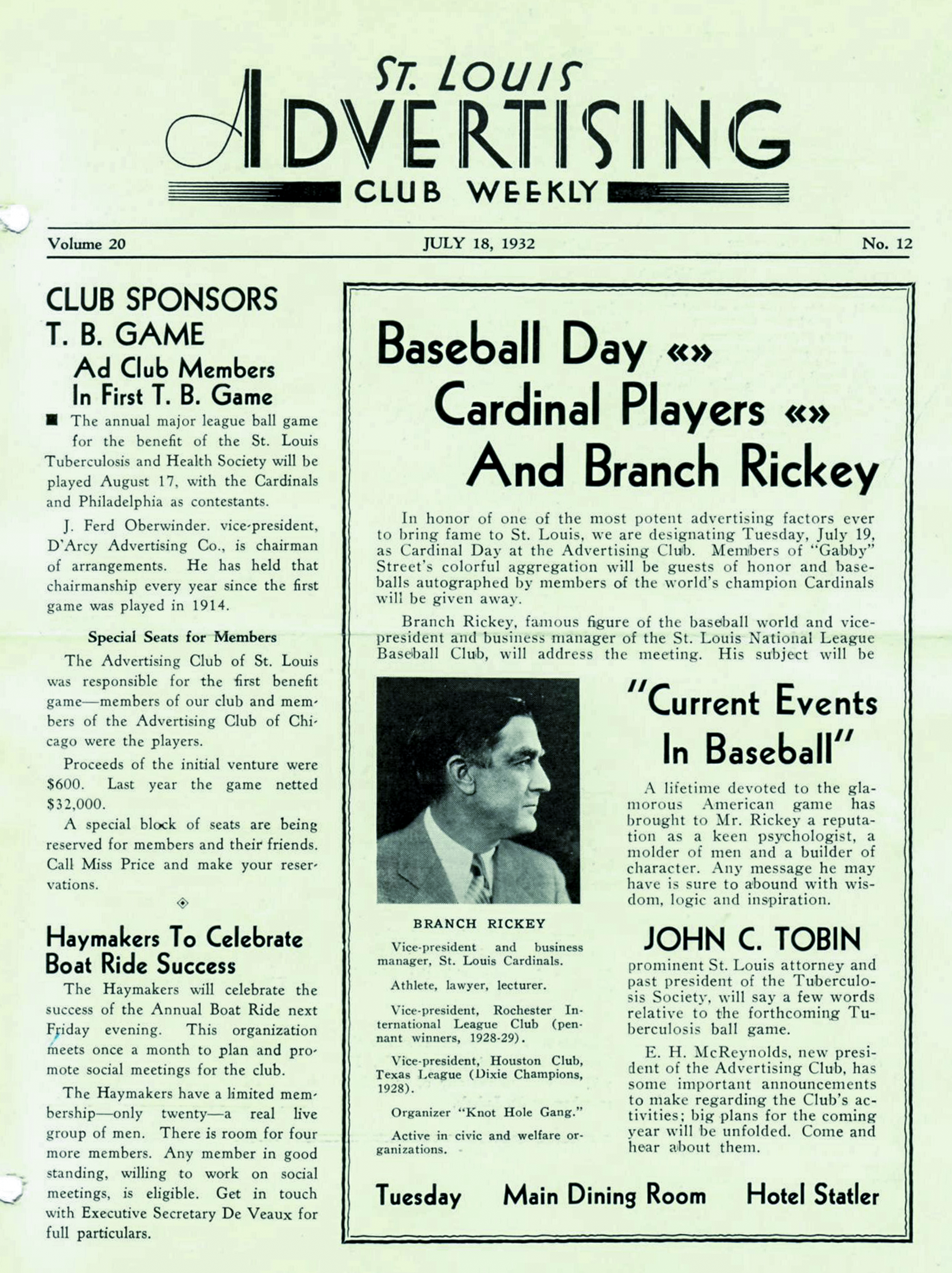 - Branch Rickey was a frequent presenter at the Advertising Club luncheons. Here is the cover of the St. Louis Advertising Weekly from July 18, 1932 promoting baseball day at the Club.