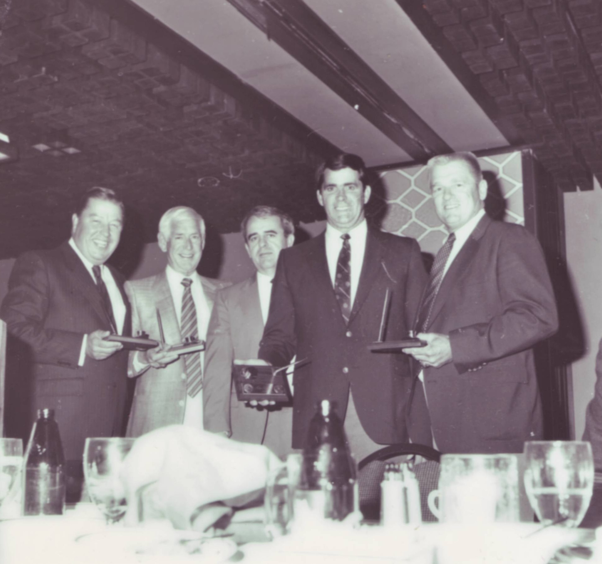 - Undated photograph from 1980s shows another Cardinals baseball day at the Ad Club luncheon. From L-R: broadcaster Jay Randolph, broadcaster Jack Buck, Ad Club officer Norm Stewart, broadcaster/former player Mike Shannon, coach Whitey Herzog.