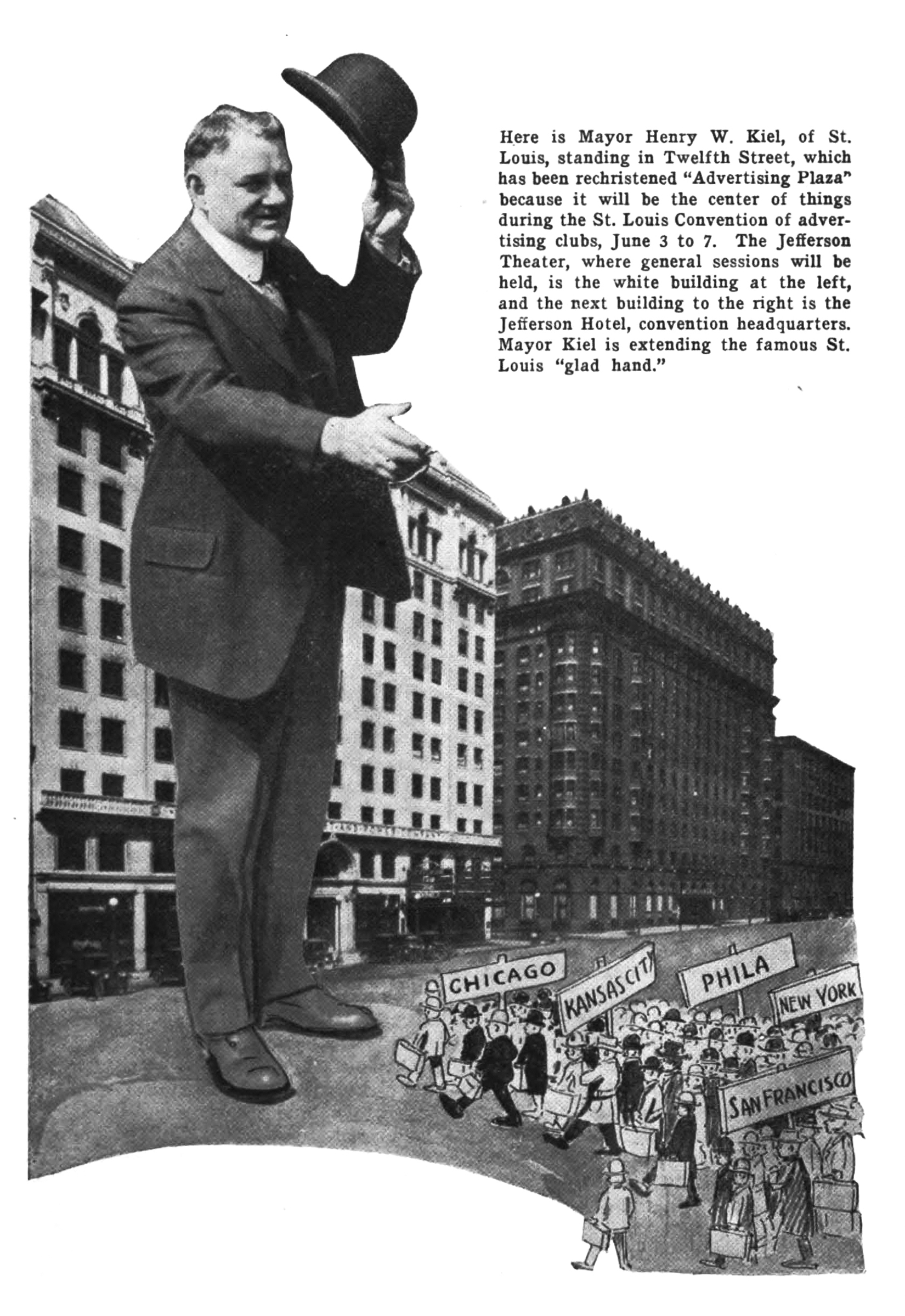This is partly due to the fact that Mayor Henry W. Kiel is a member of the club, and as M.P. Linn, president of the St. Louis club said, ‘He is not a Mayor who happens to be a member of the advertising club, but a member of the advertising club who happens to be a Mayor.’” (Associated Advertising, April 1917, pg. 34)