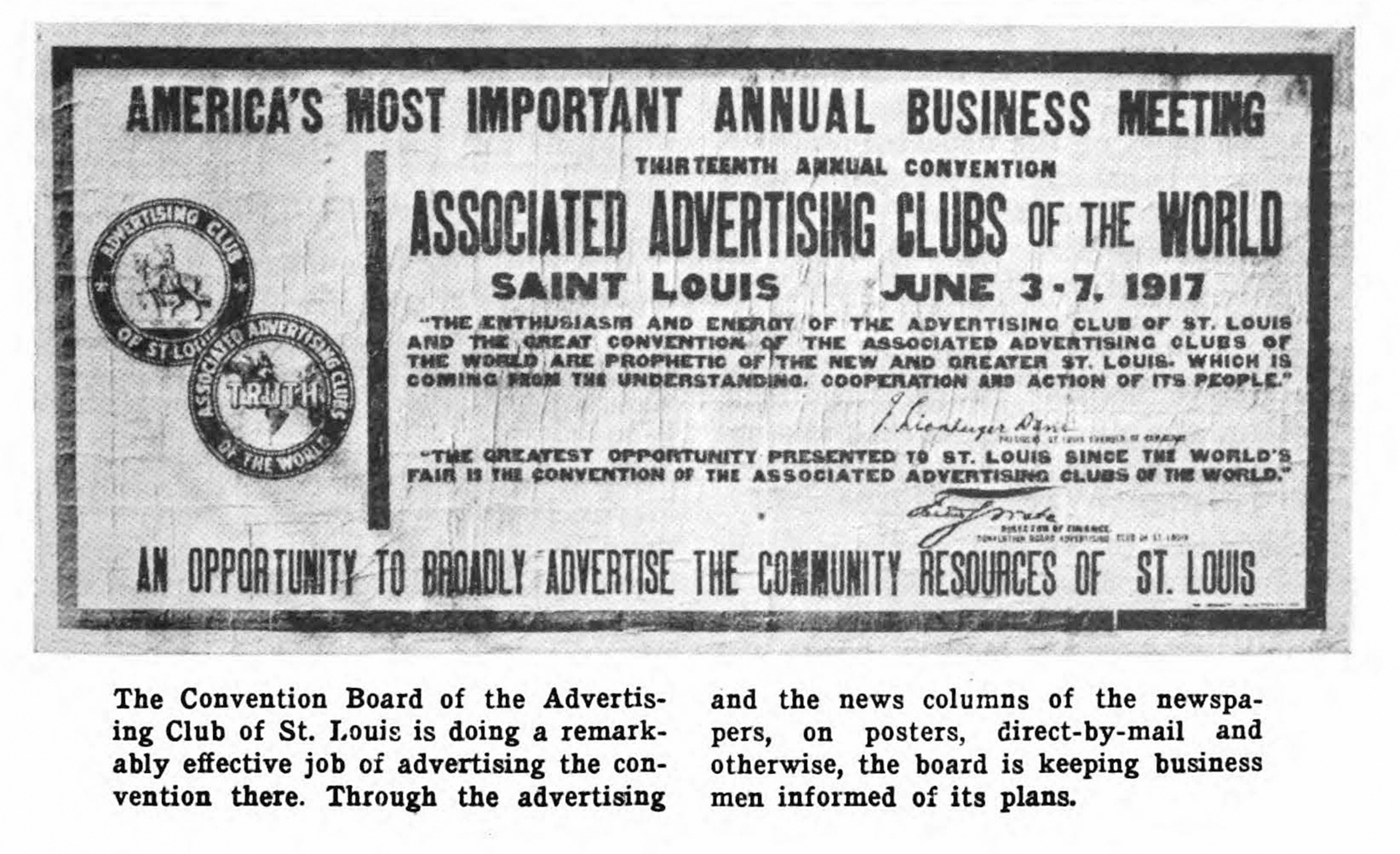 When St. Louis hosted the 1904 World’s Fair, we did not yet know that we’d also be hosting the inaugural meeting of the International Advertising Association (soon to be renamed the Associated Advertising Clubs of the World). We also didn’t know that two years later we’d be hosting the organization’s second convention. And, we definitely didn’t know we’d be hosting: “One of the greatest conventions ever held by any advertising group” from June 3 to 7, 1917.